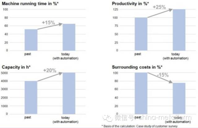 通快自动化生产线的优势 ⑴减少待机时间(图3)。机床在准备材料时可实现同步生产,人员在换班或休息时,机床不停机,从而使其运行时间延长了15%。 ⑵清晰的加工顺序可提高25%的生产效率,量身定制的生产线可优化物流走向。 ⑶增加班次(晚班和周末班),扩展20%的生产能力。 ⑷减少了场地、操作人员及配套设备(如叉车)的需求,节省了15%的外围费用。 ⑸根据需求设定库存量。料库作为物流中心管理原材料和产品等。 ⑹生产过程标准化。产品的每道工序均由软件来进行管理,生产状况清晰可见。 ⑺一次规划,分步实施。按照客户的规划方案分步实施,可减少重复投资,明确企业发展方向。 ⑻为客户提供全套解决方案。包括先期咨询→机床计划→实现自动化→引进库管系统→软件等。
