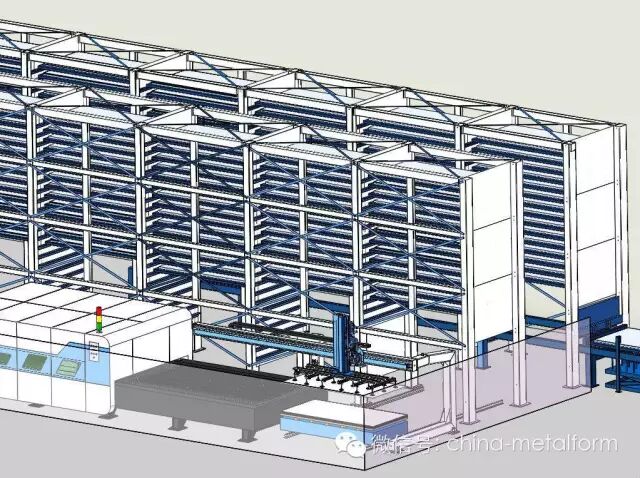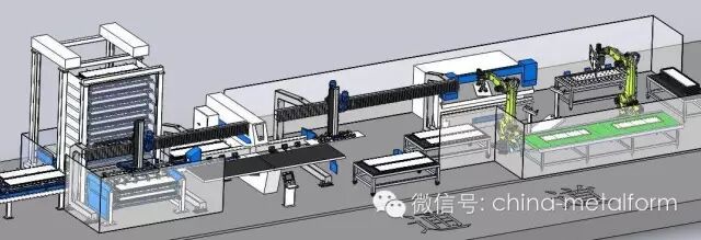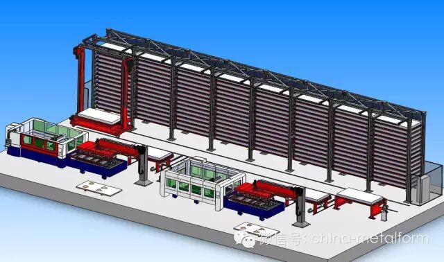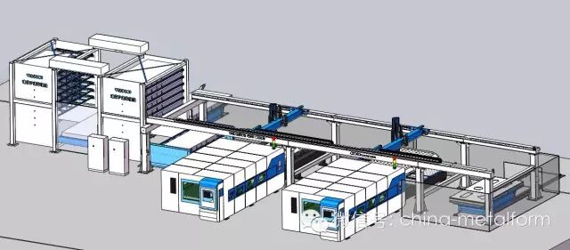 由二台激光机、(多台激光切割机)双塔料库、钣材定位机、龙门式吸盘、卸料移载机、分拣机器人、及生产线运行监控系统构成。